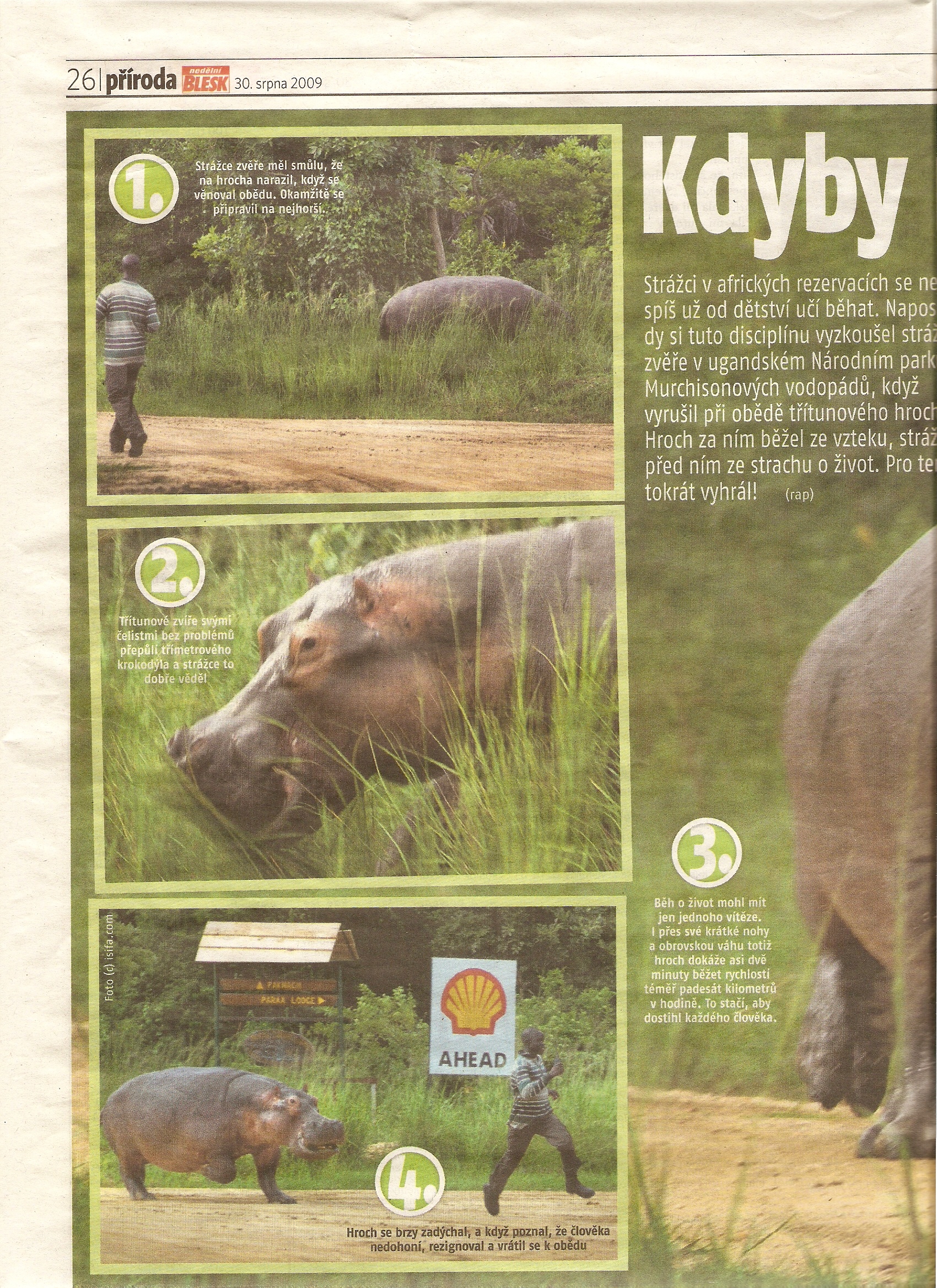 31.08.2009 07:04Rodiče mojí ženy si kupují nedělní Blesk, protože se jim prý pod ním po obědě dobře spí, neboť je tak heboučký, že když jim spadne na obličej, je to spíš jen takové láskyplné pohlazení. Já po obědě nespím a tak si ho někdy i dočtu. Včerejší číslo obsahovalo v sekci Příroda dvojstránku o rozzuřeném hrochovi, při pozornějším pohledu jde o skrytou reklamu na jistý řetězec čerpacích stanic, který nám v Brně kosí motorkáře, takže mu tímto tleskám.