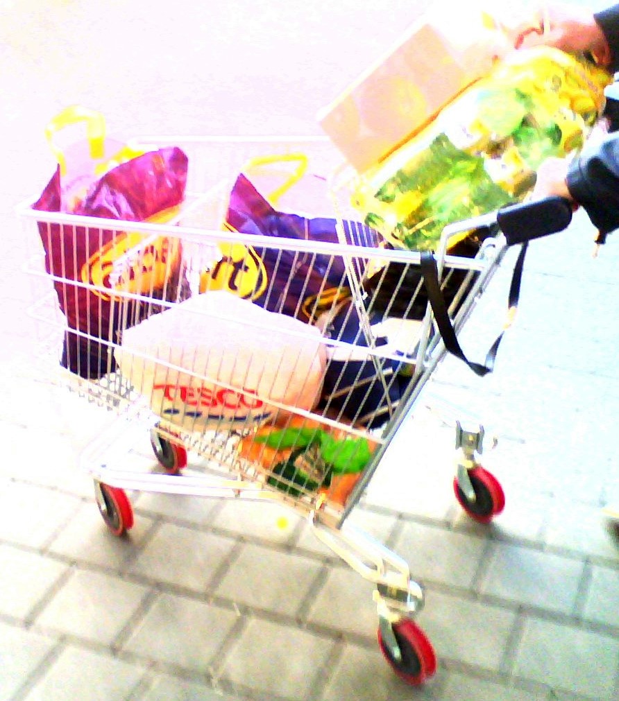 Čí nákupní vozík jsem to vyfotil? Kdopak to asi mohl být? Je jasné, že jde o osobnost nekonfromní, jelikož nákup z Teska dává drze do tašek jiného řetězce. Na druhé straně je naše celebrita ve své rebelii konzistentní, neboť anti-tašky jsou stejného druhu. Měl jsem jako první věc pochopitelně zmínit, že celebrita je ekologicky uvědomělá, protože jednorázové igelitky Tesco používá minimálně a nesnaží se do nich narvat i ty svoje minerálky. Abychom ale jen nechválili, všimněte si, že tam někde hlodá i malý paranoidní červík: svoji koženou mošničku si celebrita zatížila celými devíti kily ochucené Poděbradky, navrch přidala ještě těžko identifikovatelné cosi, patrně hajzlák (no to ale bude silvestr!). V rohu vozíku je nějaký hnědý objekt, věřme, že jde o brambory. Celebrita je vůbec od pohledu osoba lidová a skromná, nikde nevykukuje šampíčko, nikde nám z tašky ostentativně nevyklouzl pravý losos či pražská šunka. Takže ještě jednou, kdo to byl? Tipujte.