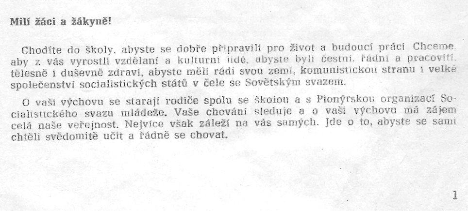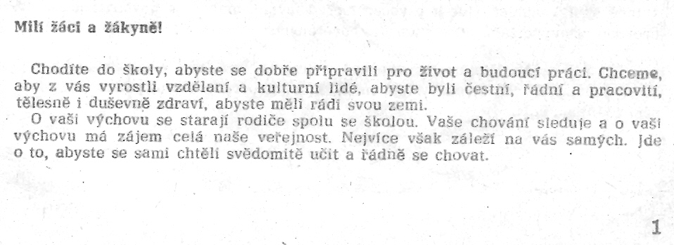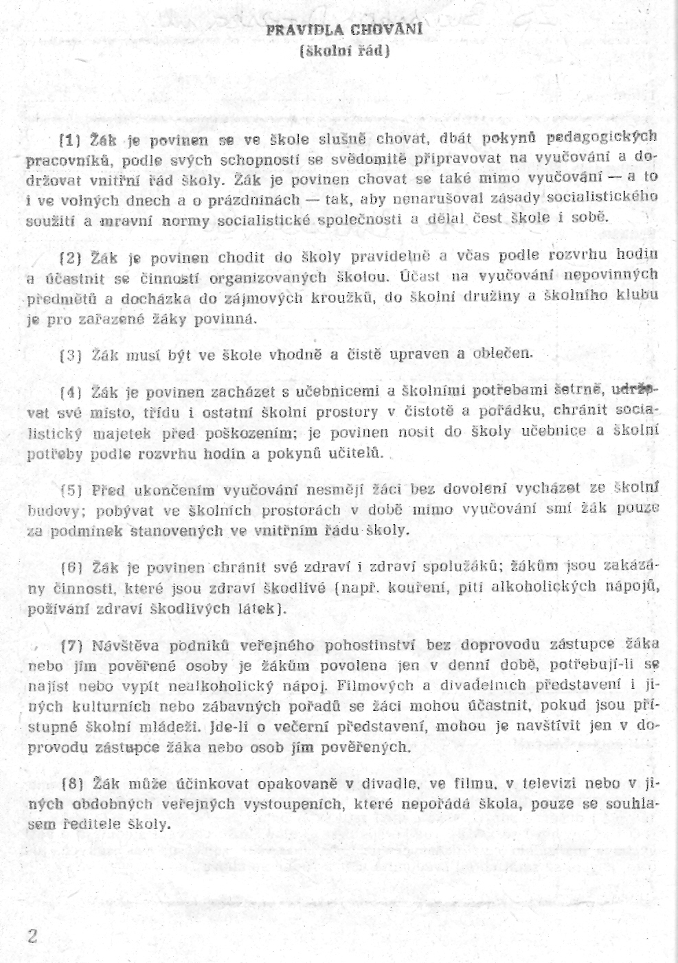 Jestliže měla revoluce kastrační vliv na Provolání k žákům, pak Pravidla chování zůstala demokratizačním procesem víceméně nedotčena. Výše je verze z roku 1990, která se od předrevoluční liší v jediném detailu. Bod (3) z roku 1988 zní: "Žák musí být ve škole vhodně, čistě a bez výstředností upraven a oblečen." Takový byl tedy účet za Sametovou revoluci: zůstaly sice zachovány zásady socialistického soužití, mravní normy socialistické společnosti (viz bod 1) i socialistický majetek (viz bod 3), mohli jsme se však začít výstředně oblékat!